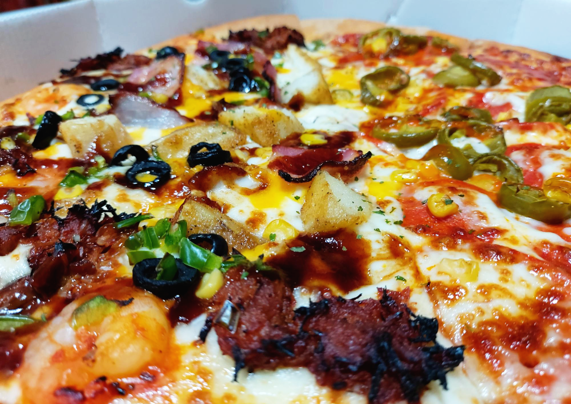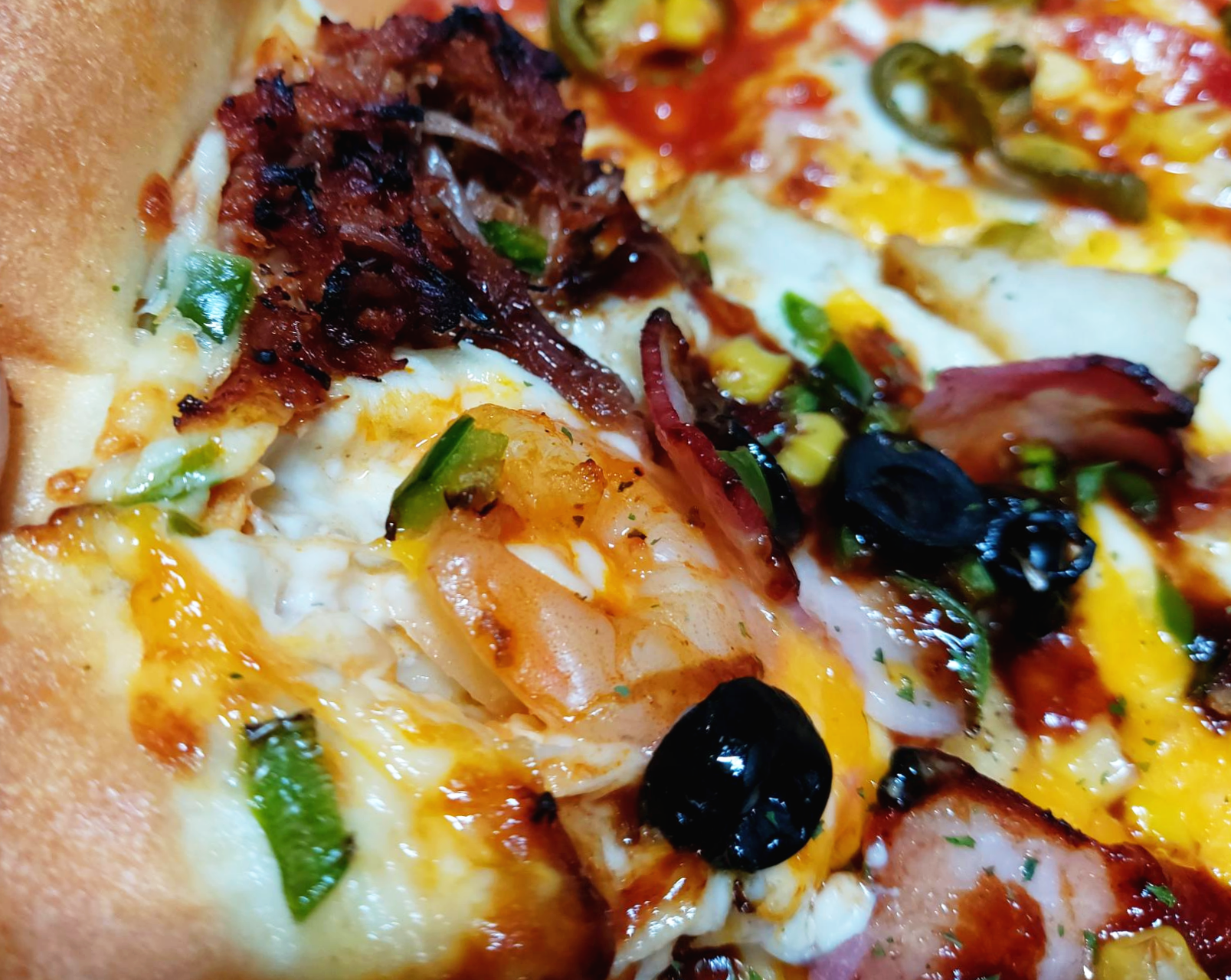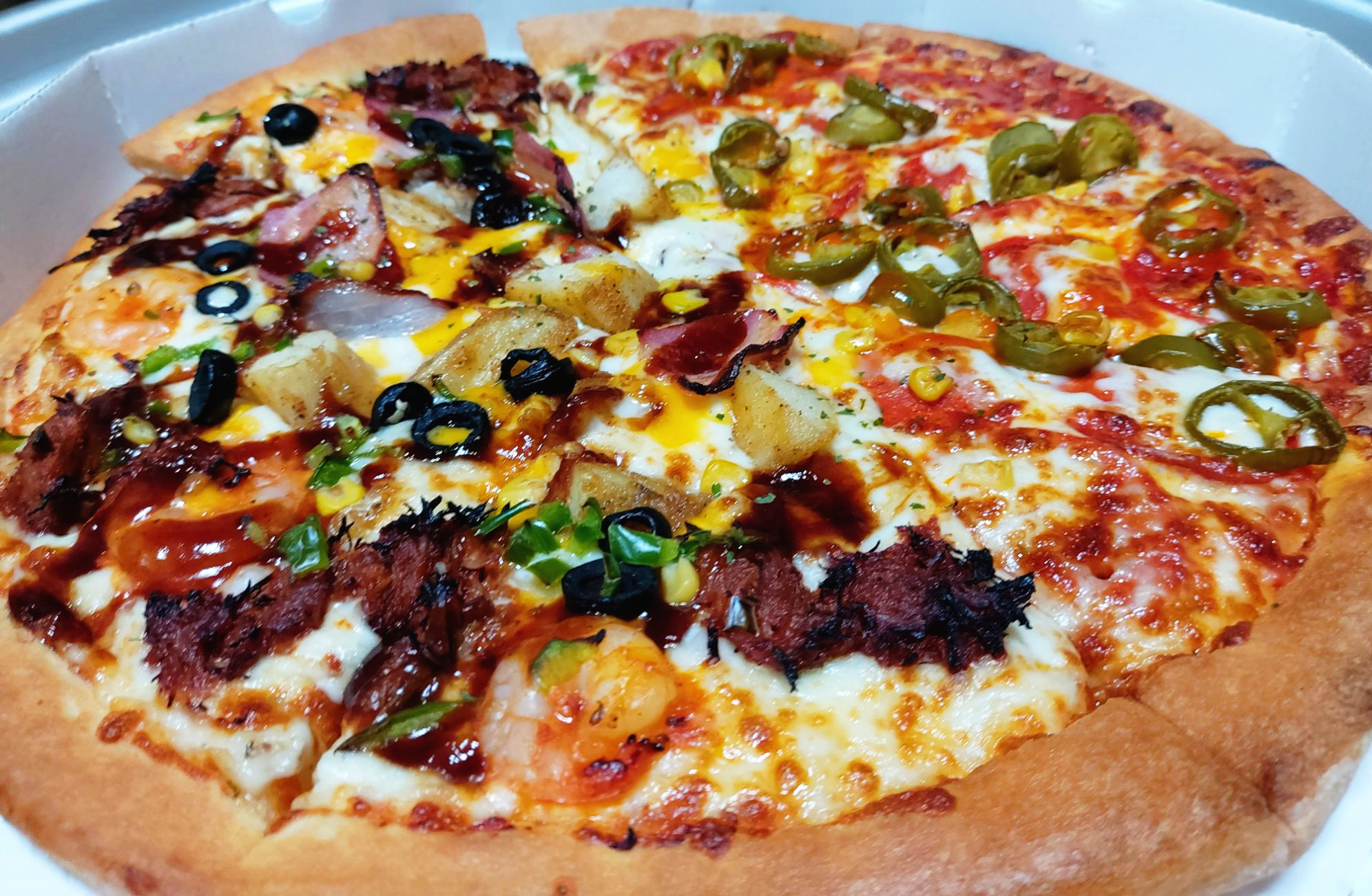 오늘 주문한 피자는 더블 포크 쉬림프에 고스트 페퍼로니 반반 피자 라지 사이즈입니다. 가끔 고스트 페퍼로니의 강력한 매운맛이 당길 때가 있습니다. 그러나 한 판 전체를 먹는 것은 무척이나 힘들기 때문에 항상 반반 피자로 시킵니다. 오늘 고스트 페퍼로니를 중화해 줄 메인 피자는 더블포크 쉬림프입니다!