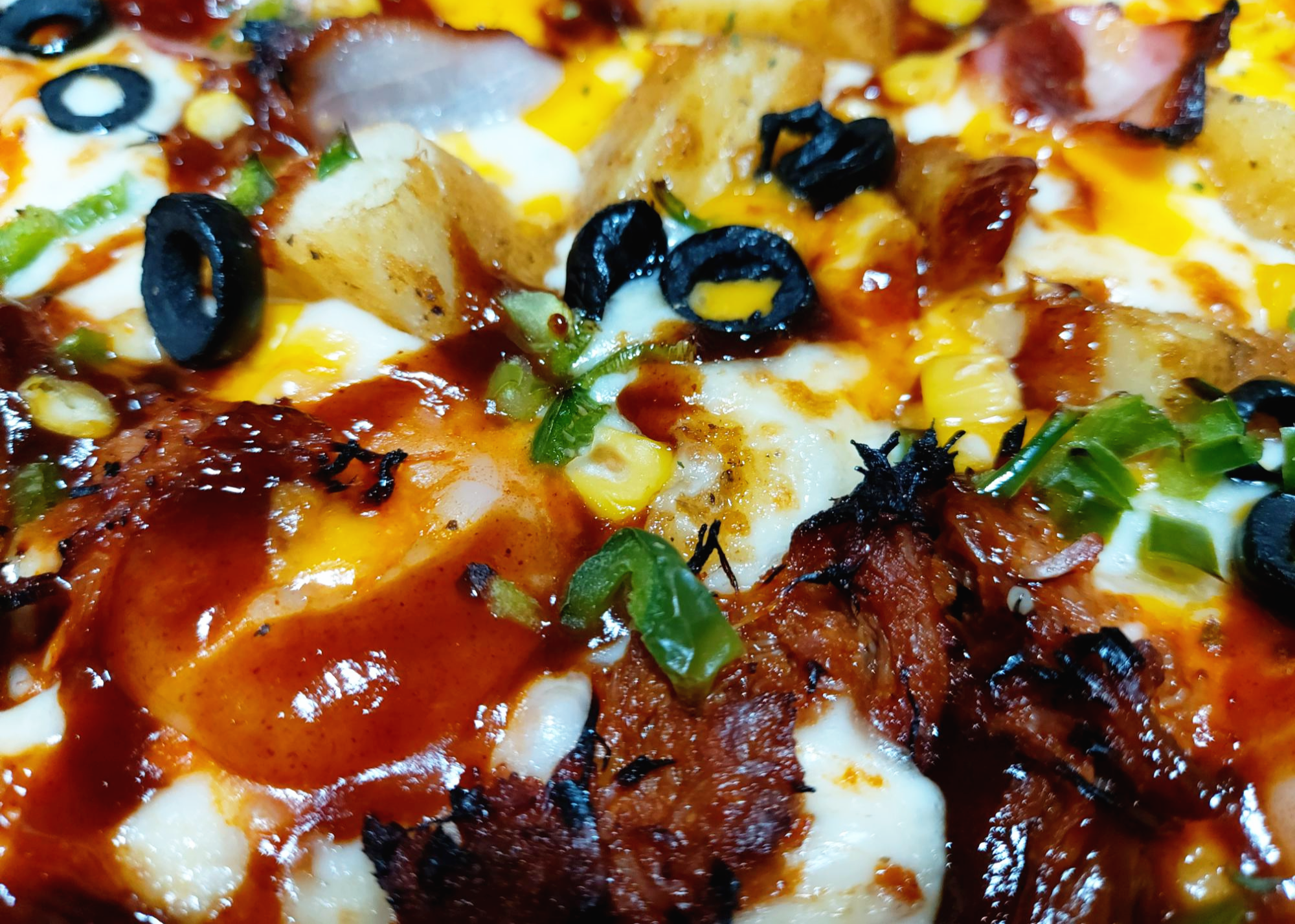 더블포크 쉬림프의 맛은 간장소스 덕분에 불고기 피자와 비슷하긴 하지만, 다양한 토핑 덕에 훨씬 고급지고 감칠맛이 넘칩니다. 불고기, 베이컨, 새우, 감자라니 제가 좋아하는 식재료는 전부 모아뒀습니다. 특히 고기가 아주아주 많아요. 토핑이 너무 많다 보니 흘러내리는 건 일상다반사네요.