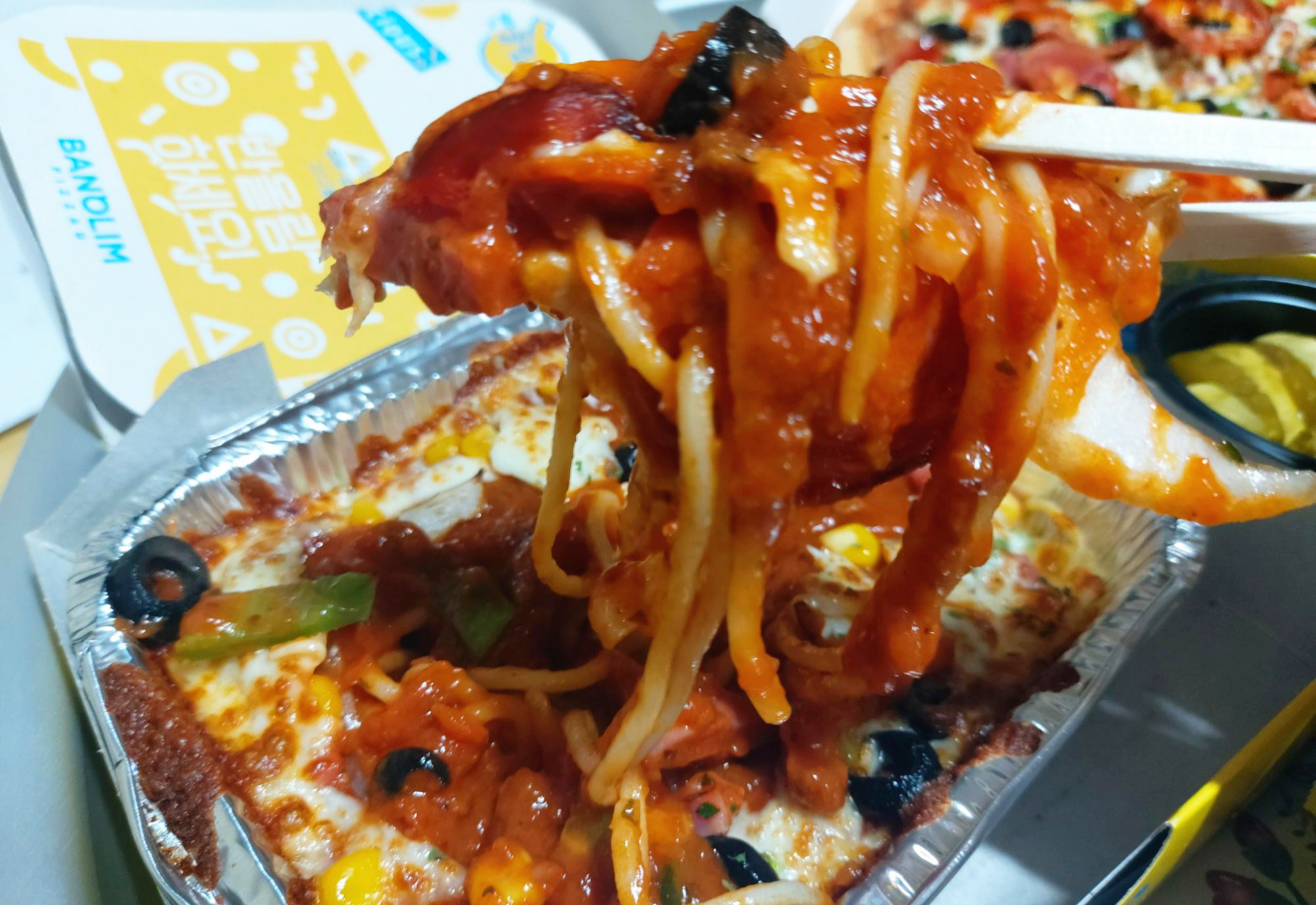 치즈 오븐 스파게티는 마치 콤비네이션 피자를 그대로 옮겨온 듯한 모습입니다. 페퍼로니, 올리브, 양파와 노릇노릇하게 그릇에 들러붙은 치즈까지! 게다가 배달이 빨라서 그런지 엄청나게 뜨거웠습니다.