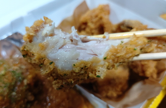 무엇보다 엄청난 크기의 치킨 조각이 가장 눈에 띕니다. 한 조각이 거의 야구공 크기만 하네요. 또한 달콤한 마늘향이 아주 맛있게 풍겨져 나오고 있습니다. 조금 커다란 크기 때문에 먹기는 조금 불편했지만, 맛 자체는 아주 만족스러웠습니다. 달콤한 소스에 마늘향이 더해져서 그런지 느끼하다는 생각은 전혀 안 들었습니다.