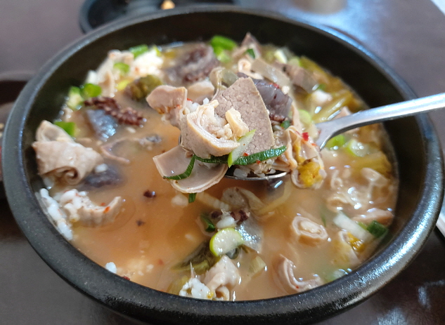 주문한 지 5분도 지나지 않아 주인아주머니께서 커다란 뚝배기를 가져다주셨습니다. 뚝배기에 가득 찬 고기와 밥 덕분에 위에 올려진 들깻가루, 파, 다진 양념이 높게 탑을 쌓았어요. 정말 푸짐해 보입니다. 또한 맛있는 순대 향이 뚝배기에서 풍겨오고 있습니다. 식당에 퍼져있는 구수한 향들을 전부 뚝배기 하나에 모아둔 것 같아요.