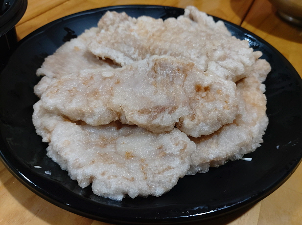 오랜만에 만난 꿔바로우입니다. 비싸서 평소에 자주 접하지 못하던 음식이었는데, 덕분에 맛도 보고 유사 효도도 해보고 감개무량하군요. 넓적한 하얀색 겉면에 좌르르 윤기가 흐르는 것이 정말 먹음직스럽습니다. 중자는 큼직한 덩어리가 5덩어리입니다.