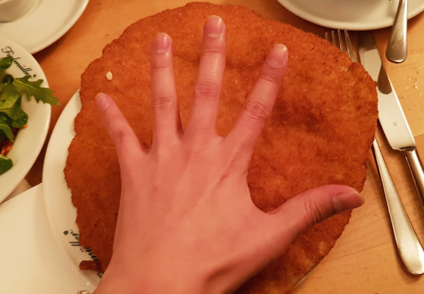 원래 정통 슈니첼이 소고기를 이용한 음식인데, 전쟁으로 가난해지자 돼지고기를 이용해 대체품으로 만들었던 것이 돼지고기 슈니첼이라고 한다. 메뉴판에서 소고기 슈니첼이 Wiener schnitzel으로 표기되어있는 것을 보고 놀랐다. 빈 사람의 슈니첼이라니! 이건 무조건 먹어야 해! 하지만 Wiener schnitzel은 돼지고기 슈니첼에 비해 꽤 비싸고 양이 적다. (사진의 작은 두 덩이가 20.5 eu 였다.)