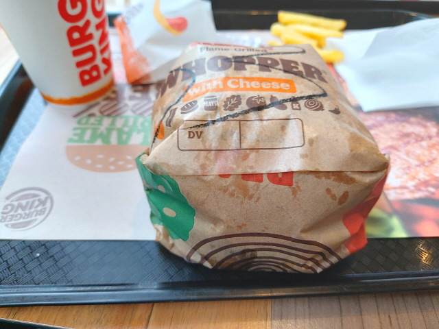 엄청난 높이입니다. 토마토나 양상추도 조금 더 들어간 느낌인데, 아래쪽의 검은색 노란색 층이 너무 거대해서 신경 쓸 여유가 없습니다. 냄새는 치즈와퍼 특유의 불맛향과 치즈향이 아주 강하게(x3) 납니다.