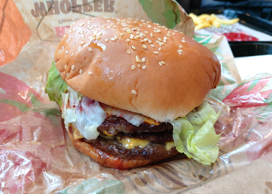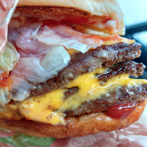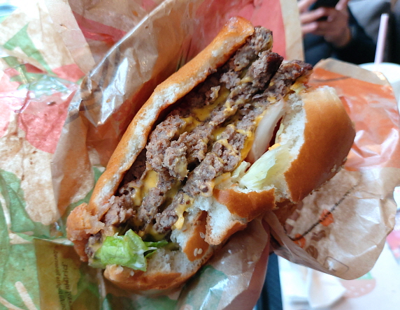 맛은 정말 좋습니다. 대신 엄청나게 느끼합니다. 원래 치즈버거를 별로 좋아하지 않는데, 치즈가 무려 3층이나 끼워져 있어서 정말 고역이었습니다. 전체적인 양은 햄버거 2개 정도 되는 느낌인데 느끼함 때문에 정말 힘들었습니다. 콜라도 하나로는 부족하고, 김치가 너무 생각하는 식사였습니다. 양이 적거나 느끼한 것을 못 참는 분들은 도전하지 마시길 바랍니다.
