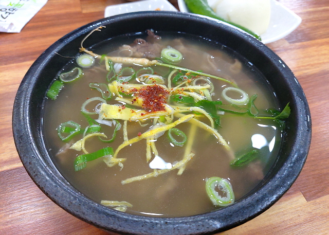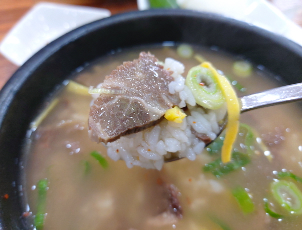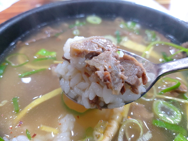 드디어 뚝배기에 펄펄 끓는 곰탕이 나왔다. 돼지국밥이나 콩나물국밥은 자주 먹어도 소고기로 만든 곰탕은 꽤 오랜만에 먹는다. 맑은 국물 아래 드문드문 보이는 소고기가 정말 매력적이다. 둥둥 떠있는 작은 인삼도 매력적으로 보인다.