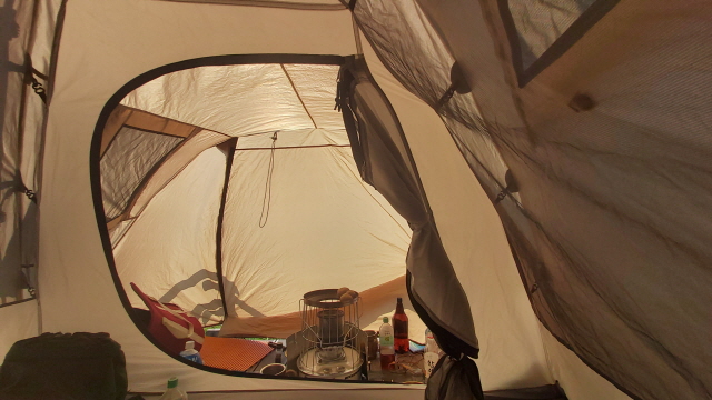 없어진 물건이 있나 확인도 해보고, 어질러진 집기를 적당히 정리했다. 입구를 전부 동여매고 내부에서 조금 휴식을 취했다. 바람 진짜 쥰내 세다. 텐트가 어떻게 날아가지 않고 버티고 있었는지 의문이다.