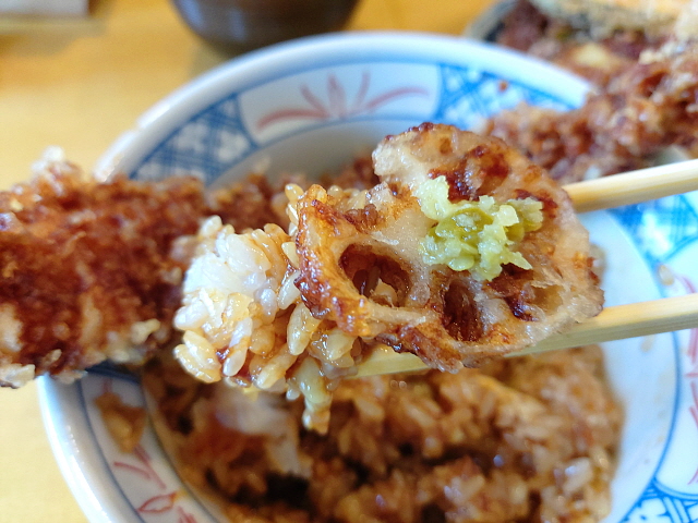 순서대로 연근튀김, 새우튀김, 고추튀김, 가지 튀김이다. 해산물이나 고기를 튀긴 것도 좋아하지만 진짜 기대했던 것은 야채튀김들이다. 재료 자체도 엄청 커다랗고, 울퉁불퉁하게 입혀진 튀김옷 위에 마구 뿌려진 소스의 모습이 진짜 아름다웠다. 무질서한 모습이 훨씬 식욕을 당긴다고나 할까.
