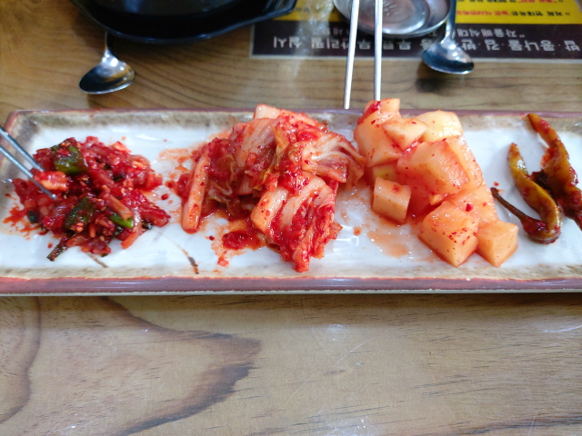 전주 현대옥에서는 오징어젓갈, 김치, 깍두기, 장아찌, 김 그리고 쌀밥이 무제한 제공됩니다. 식당 주인의 눈치를 보면서 셀프코너에서 그릇 가득 담아서 먹어치우곤 합니다.