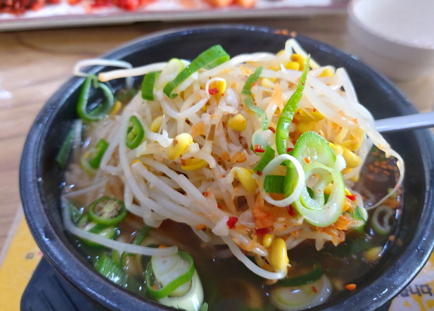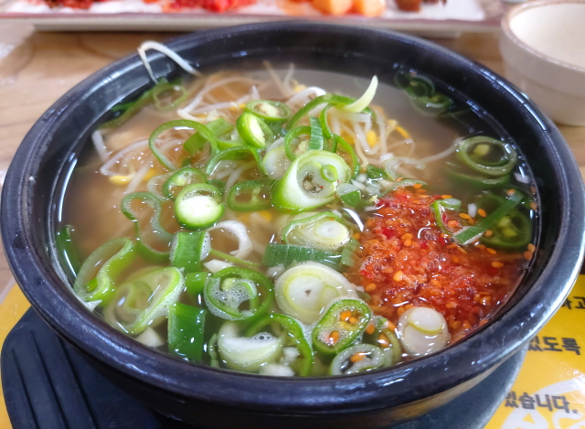 아삭아삭한 콩나물, 대파, 매콤한 고추 등의 다양한 재료들이 맑은 국물에 잠겨있는 모습이 정말 먹음직스럽습니다. 식감이 폭발하는 콩나물과 함께 시원하고 얼큰한 국물을 함께 먹는 순간, 속이 확 풀립니다. 소주가 정말 강하게 당기는 그런 맛입니다.
