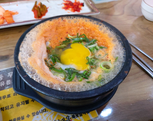 보기만 해도 든~든해 보입니다. 정말 몸에 기운이 없거나 허기가 극심하게 질 때, 계란을 푼 국밥만큼 좋은 것이 없을 겁니다. 콩나물국밥의 얼큰함, 그 안에 풀린 계란의 특유의 고소한 맛의 조합은 미칠 정도로 좋습니다.