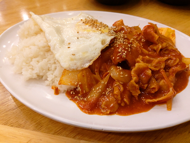 네번째 메뉴 제육덮밥, 순두부찌개와 양대산맥을 이루는 식사메뉴로써 맛이 없을 수 없는 메뉴다. 하지만 김밥매니아의 제육덮밥은 왜 케찹맛이나고 달달한걸까...... 고기야 맛있지만 양념은 매콤하기만 해야 맞다고 생각한다.