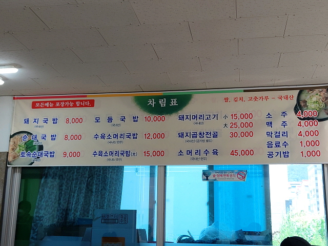 메뉴는 순대 및 돼지고기를 이용한 메뉴와 소머리고기 메뉴가 있다. 내가 선택한 메뉴는 모둠국밥. 원래는 돼지국밥을 먹고 싶어서 찾아왔었는데, 옆 테이블을 슬쩍 훔쳐보니 순대가 엄청 커다랗고 실한 것이 아닌가? 바로 순대와 돼지고기를 같이 주는 모듬으로 주문했다.