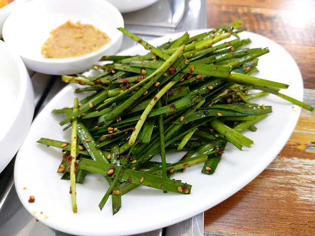 참기름 향이 솔솔 나는 부추김치를 국밥 위에 투척했다. 다진 양념 양념을 적당히 넣고 본격적으로 먹기 시작했다.
