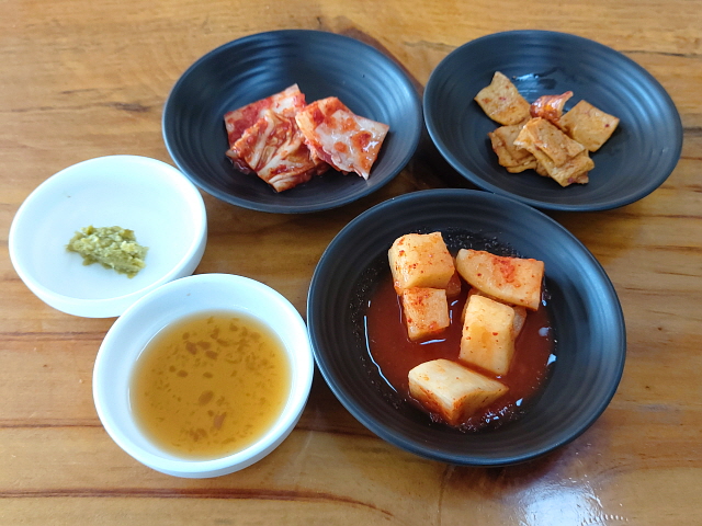 기본 반찬은 크게 특별한 것은 없다. 배추김치, 깍두기, 어묵볶음, 소스, 간 고추. 소스는 참기름인 줄 알았지만 살짝 새콤달콤한 식초 간장 베이스다. 고추를 저렇게 갈아서 주는 것은 처음 본다.