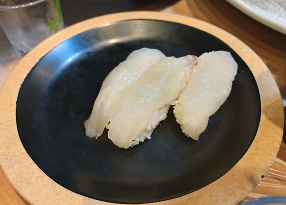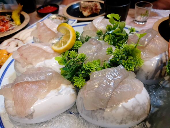 광어회는 정말 고급스럽게 플레이팅 되어서 나왔다. 플레이팅 때문에 양이 무척 적어 보인다. 하지만 접시가 엄청 크고 회끼리 드문드문 떨어져 있어서 그렇게 보이는 것뿐, 양이 꽤 많았다. 신선하고 쫄깃쫄깃해서 정말 맛이 좋았다.