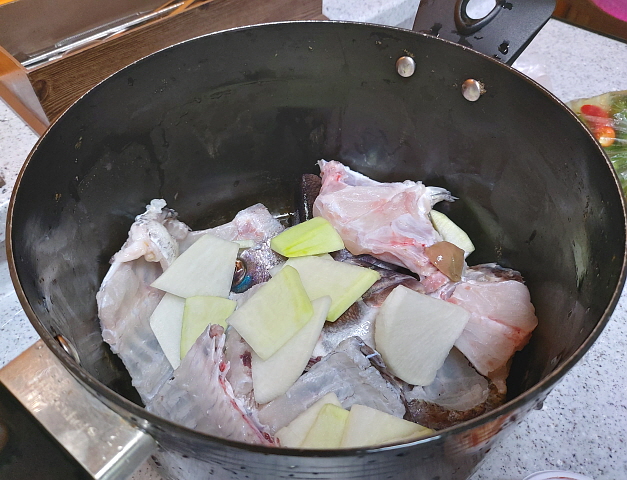 또한 도미 서더리와 매운탕용 양념과 야채까지 따로 챙겨줬다. 회에 이은 얼큰한 매운탕이라니 완벽한 서순이다.