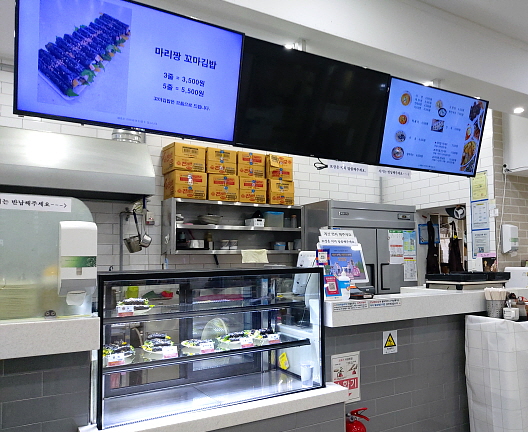 꼬마김밥의 경우에는 얇고 짧은 작은 김밥이었는데, 다양한 속재료가 들어간 김밥들이 미리 진열대에 준비되어 있었다. 그래서 원하는 김밥을 선택하면 바로 썰어서 내어주기 때문에, 음식이 나오는 속도가 무척 빨랐다. 빠른 음식 준비는 역전 식당의 정석이나 다름없다.