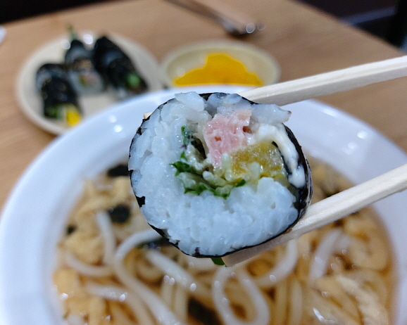 우리는 꼬마김밥 3줄과 우동 2개를 주문했다. 우동과 김밥을 같이 할인 세트메뉴도 있으니 참고하길 바란다.