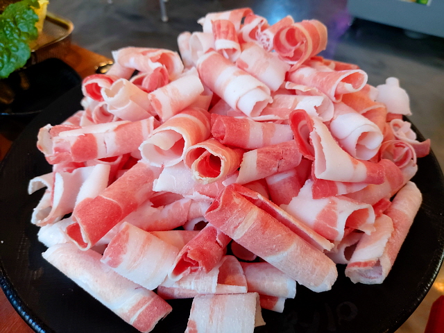 금방 접시에 수북하게 담겨 대패 삼겹살이 담겨 나왔다. 붉은색 종이를 돌돌 말아 놓은 것 같다. 적당한 가격에 이 푸짐한 양이 너무나도 기분이 좋다. 500g에 18,500원. 가성비 최고!
