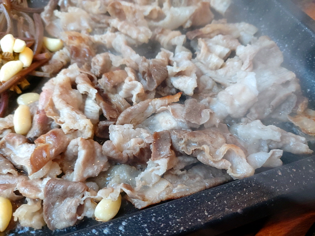 살짝 기울어진 불판 위에는 정말 다양한 음식들을 올려서 구워 먹을 수 있다. 상단에는 새 삼겹살을, 중심에는 익어가는 삼겹살을 올린다. 하단의 기름이 빠져나가는 구멍 주변에는 김치와 콩나물, 고사리, 마늘 등을 듬뿍 올려준다. 삼겹살에서 새어 나온 기름이 김치와 콩나물을 자연스럽게 볶아주니 정말 맛있어진다.