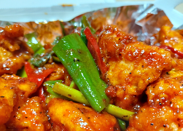 오늘의 메뉴는 황올한 깐풍치킨 순살이다. 바삭바삭 잘 튀겨진 순살 치킨에 매콤한 깐풍 소스가 듬뿍 묻혀 있고, 새파란 파와 붉은색 고추 조각이 위에 올려져 장식하고 있다. 그리곤 후추로 마무리.