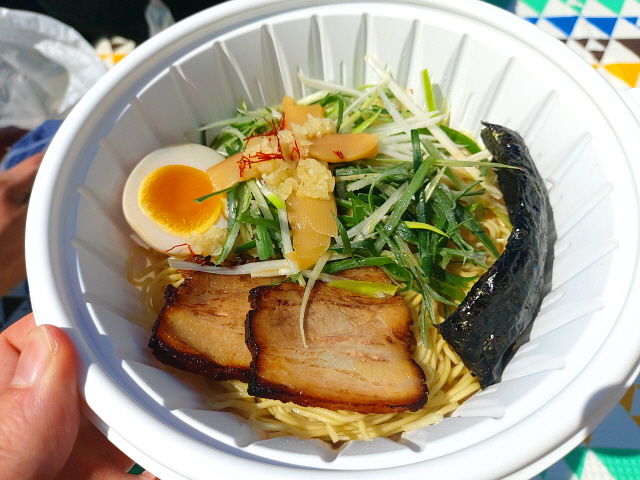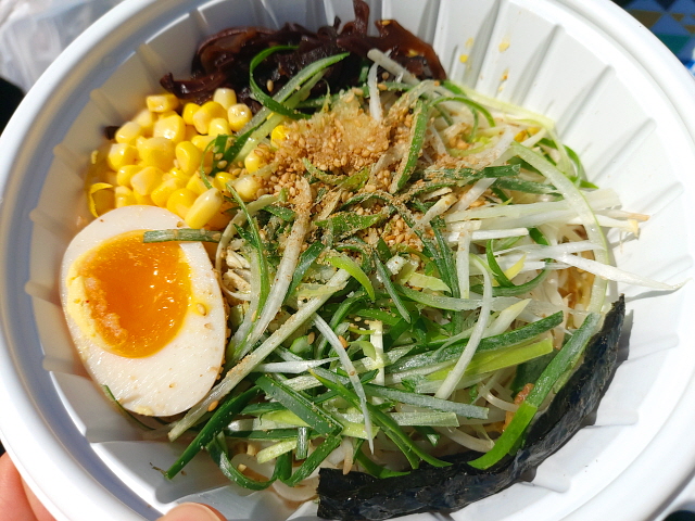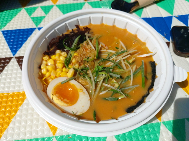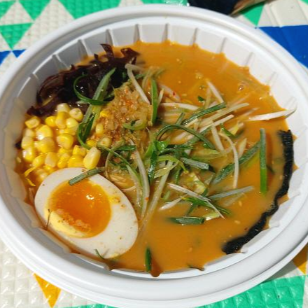 반숙란, 파, 목이버섯, 스위트콘이 잔뜩 들어있는 미소라멘이다. 재료가 그릇에 정말 가득 담겨있었다. 육수는 따로 뜯기 쉬운 포장에 담겨서 따로 왔다. 붓기만 하면 라멘 완성이다.