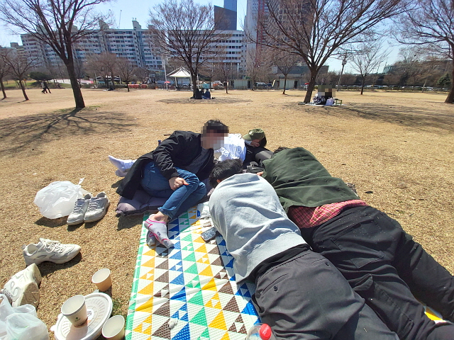평일 낮임에도 불구하고 꽤 많은 사람들이 있었다. 구름 한 점 없이 맑은 날이라 기분은 좋다. 문제라면 남자 5명이서 몰려온 그룹은 우리 뿐이라는 것이다. 좁은 돗자리에 큼직한 덩어리들이 옹기종기 뭉쳐있는 느낌이 묘했다.