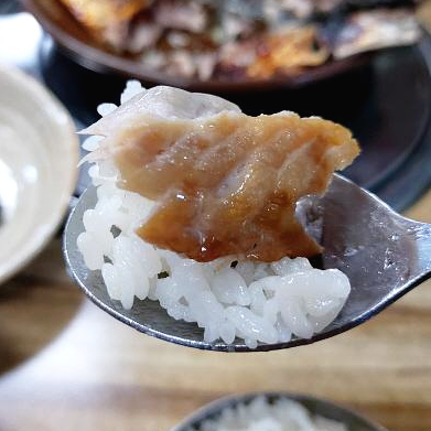 완벽하게 구워진 고등어 구이다. 껍질을 태우듯이 구우면서도 속살은 윤기가 넘치는 것이 겉바속촉의 진수를 보여준다. 이 작품은 주인아주머니의 실력일까, 오븐이 좋은 것일까?