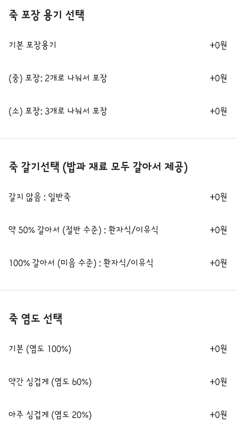추가 선택사항을 보고는 살짝 놀랐다. 죽을 나눠 담는 개수, 죽을 가는 정도, 죽의 염분 양의 조절이 가능했다. 고객층을 정확히 파악한 서비스였다.
