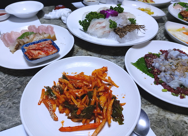 목포식 한정식을 처음 경험하는 우리들은 살짝 당황하고 있었다. 왜 회가 우르르 나오는 것이지? 음식이 나왔으니 맛있게 먹기는 하겠지만, 상당히 생소했다.