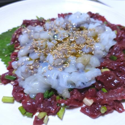 낙지육회탕탕이, 목포에서 가장 유명한 음식을 꼽자면 바로 탕탕이가 아닐까 싶다. 낙지와 생고기를 큰 칼로 탕탕 쳐서 참기름과 간장 양념을 버무린 음식이다. 꾸물대는 낙지 조각과 검붉은 육사시미가 꽤나 어울린다. 고소함에 고소함을 더한 맛이 일품.