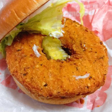 정말 치킨 패티가 도넛처럼 속이 뻥 뚫려있다. 피클이 구멍에 쏙 빠질 정도로 구멍이 크다. 중심을 비우고 나머지를 더 두텁게 채운 것일까, 치킨 패티가 상당히 두껍다.