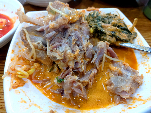 첫인상은 커다란 철제 냄비에 매콤한 콩비지찌개가 가득 담겨 있는 느낌이었다. 겉모습 측면에서만 보면 고개가 갸웃할 정도의 비주얼이었다. 감자탕이면 당연히 있어야 할 등뼈는 보이지 않는데 콩가루, 콩나물, 우거지만 보이니 그럴 수밖에 없다. 그나저나 중 짜리 감자탕인데도 양이 참 많다는 생각을 했다.