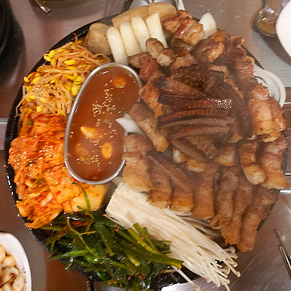 다음 주문은 통삼겹 구이 한판이다. 역시나 금방 음식이 나왔다. 미리 고기를 초벌해 두는 것일까? 모둠구이에서 야채나 소스 구성은 똑같이 고기 구성만 바뀌었다. 한판에 무려 480g이지만 역시나 금방 사라졌다. 우리는 그냥 무한리필 집이나 가야 하는 것일까?