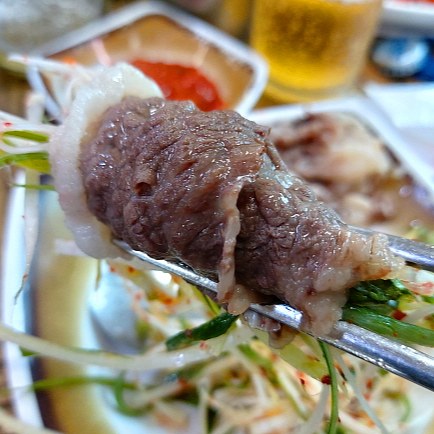 차돌박이라는 부위는 얇지만 상당히 기름지기 때문에, 소고기의 맛을 제대로 즐길 수 있다. 소금 기름장에 살짝 찍어서 짭짤함을 더하고, 파무침을 곁들여서 느끼함을 잡아주면 완벽하다.