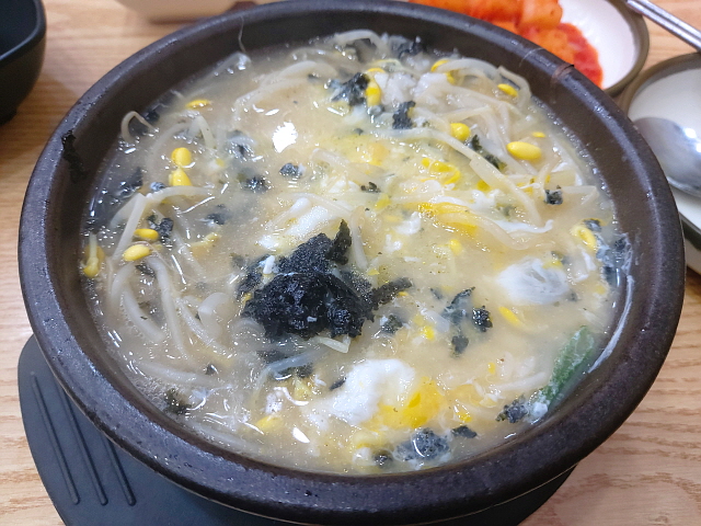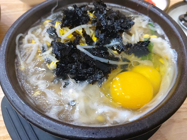 2알만 넣어도 계란국이 된다. 풀지 않고 수란형태로 베어먹는 것도 맛있지만, 휘휘 풀어서 국물의 감칠맛을 더하는 편을 더욱 선호한다. 김가루를 추가하거나 깍두기로 입가심을 해서 간을 맞춘다면, 콩나물 국밥이 더욱 맛있어진다. 든든하다.