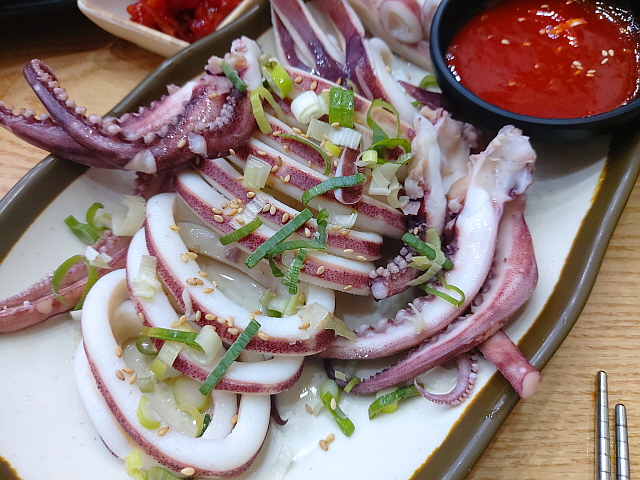 안주로 주문한 통 오징어 숙회, 새콤한 초장과 쫄깃한 오징어의 조합은 아주 좋다. 소주 한 잔이 쫄깃하게 맛있어지는 효과가 있다.