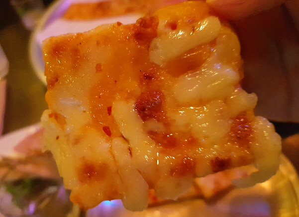 한 조각씩 떼먹다 보니 테트리스를 하는 듯한 느낌이 났다. 술 한 잔 마시고 짭짤한 피자 한 조각 냠냠, 이렇게 먹다 보니 순식간에 술병이 비워진다. 피자의 엄청난 크기와 반비례하는 부담 없는 피자 조각 때문일까? 술을 마시는 속도도 빨라져서 금방 새 술을 주문하게 된다.'