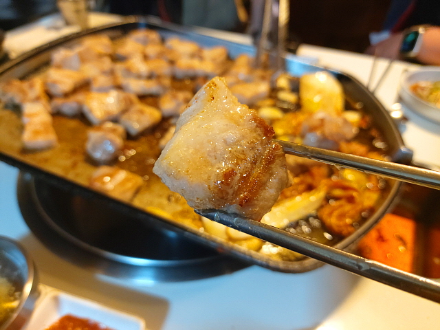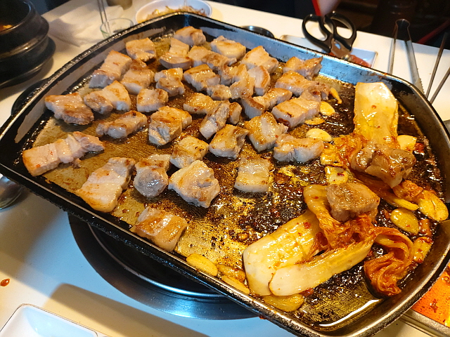 김치와 마늘도 적당히 기름 투입구 옆에 얹어준다. 삼겹살이 줄줄 흘리는 기름을 먹고 튀겨지듯 맛있어지고 있다.