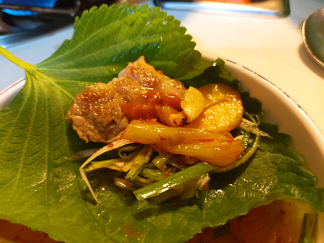 차려진 반찬은 별로 없지만, 갖출 것은 전부 갖췄다. 깻잎에 파채절임과 볶음김치, 튀긴 마늘, 쌈장을 올려놓고 삼겹살을 2~3점씩 올려서 쌈을 싸버리자. 입 안 가득 폭발하는 다채로운 맛에 빠져든다.