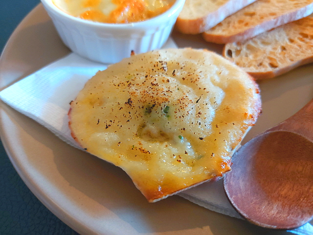 작은 가리비 껍질 위에 있는 걸쭉한 스튜 느낌이다.