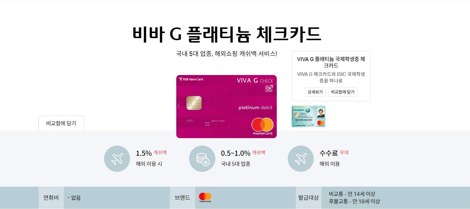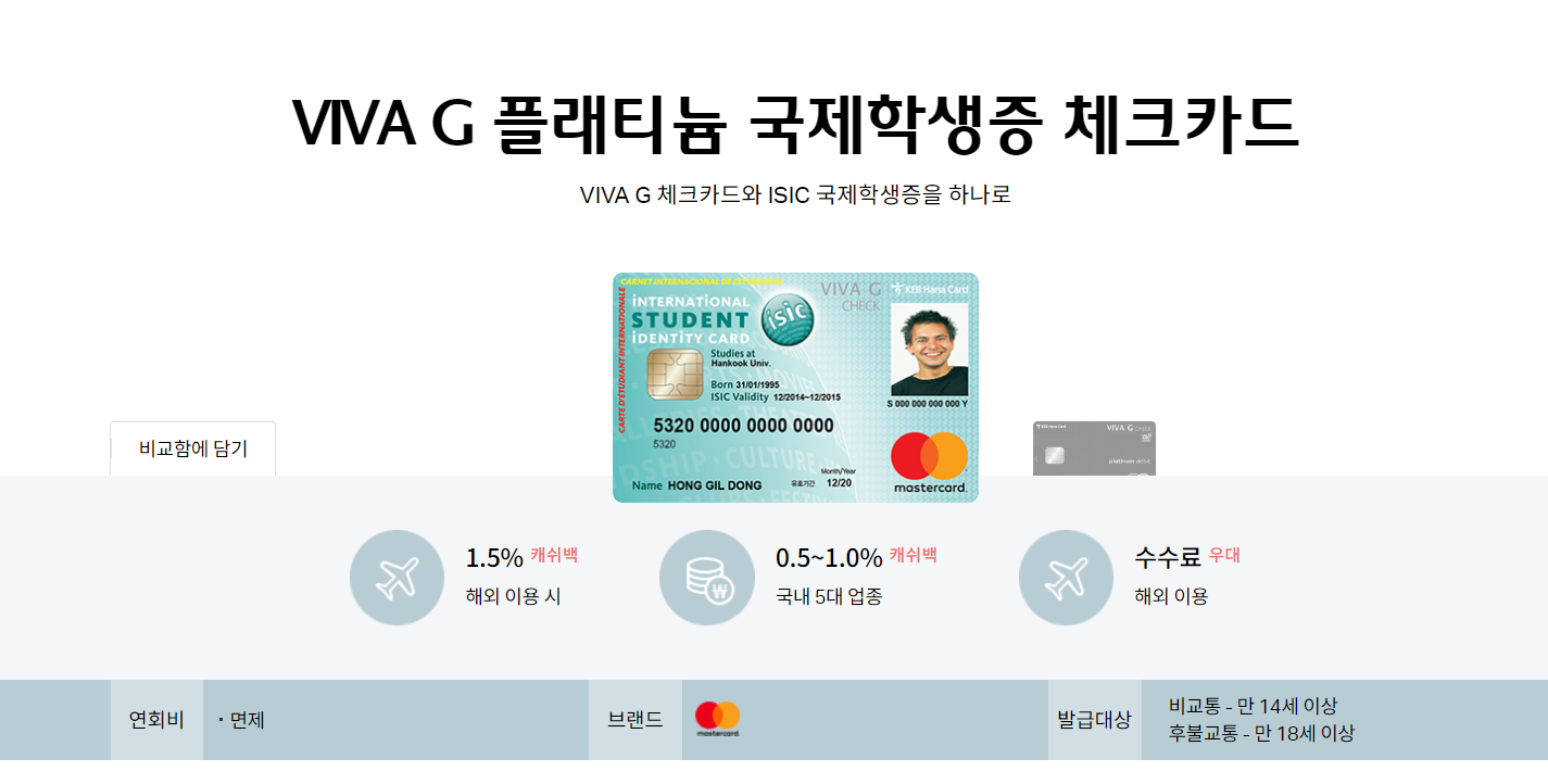 VIVA G 플래티늄 체크카드가 주는 혜택과 ISIC의 국제학생증의 혜택을 전부 받을 수 있는 카드입니다.