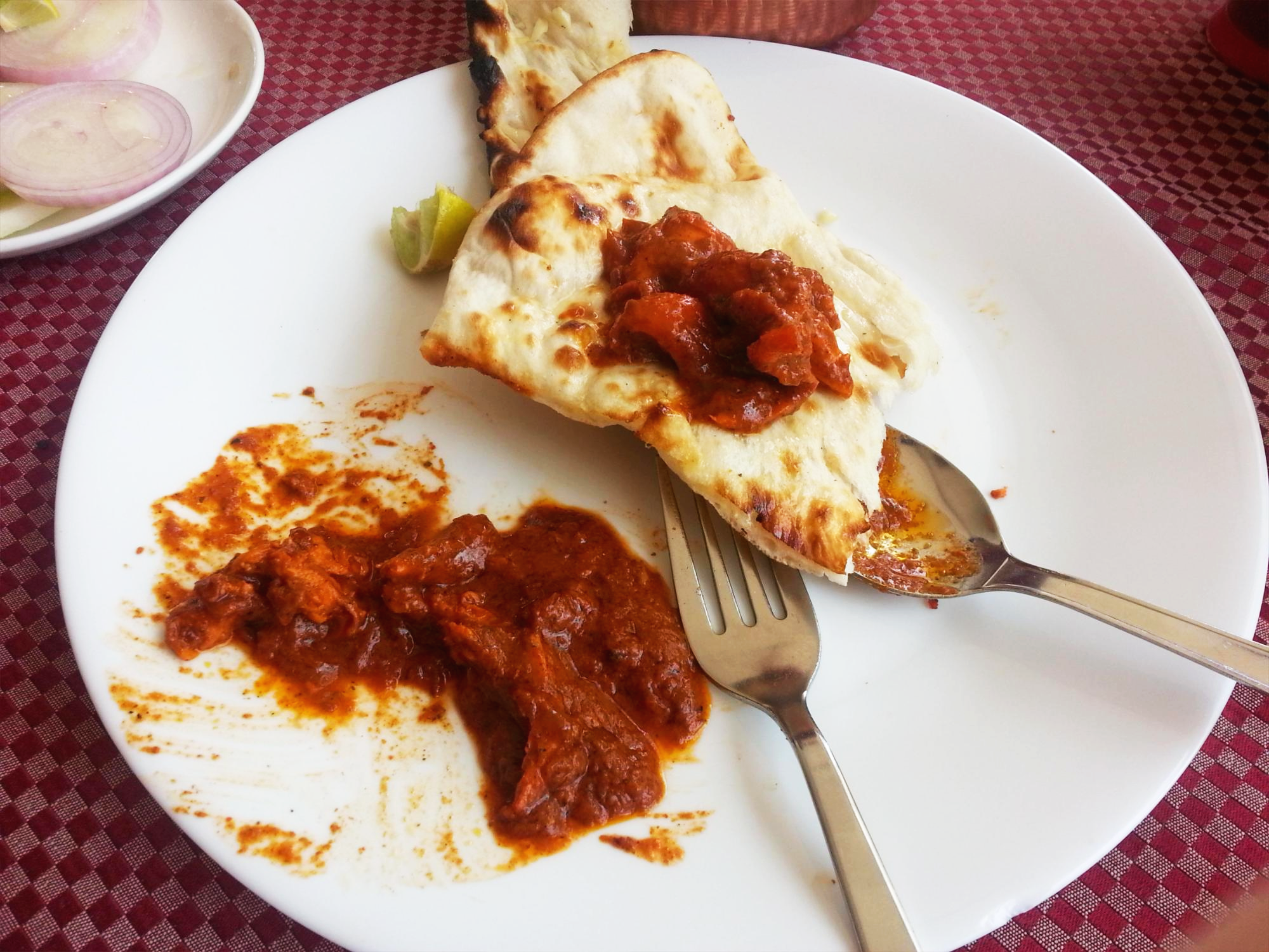 버터 치킨이 무엇인가 하니, 난을 먹을 때 곁들이는 양념장을 말하는 것이었다. 조금 기름지긴 하지만 닭고기와 향신료가 정말 조합이 잘 되어있어서 아주 맛이 좋았다. 기본, 버터, 갈릭 세 종류의 난을 돌려서 먹는 것도 풍미를 극대화시켰다. 야채 초절임은 사실 손도 안 댔다. 아직 인도에 온 지 얼마 되지 않아서 생야채 류는 될 수 있으면 섭취하지 않는 편이 좋다고 한다. 물갈이도 하는 데, 익히지 않은 음식은 몸이 더욱 거부할 수도 있기 때문이다.