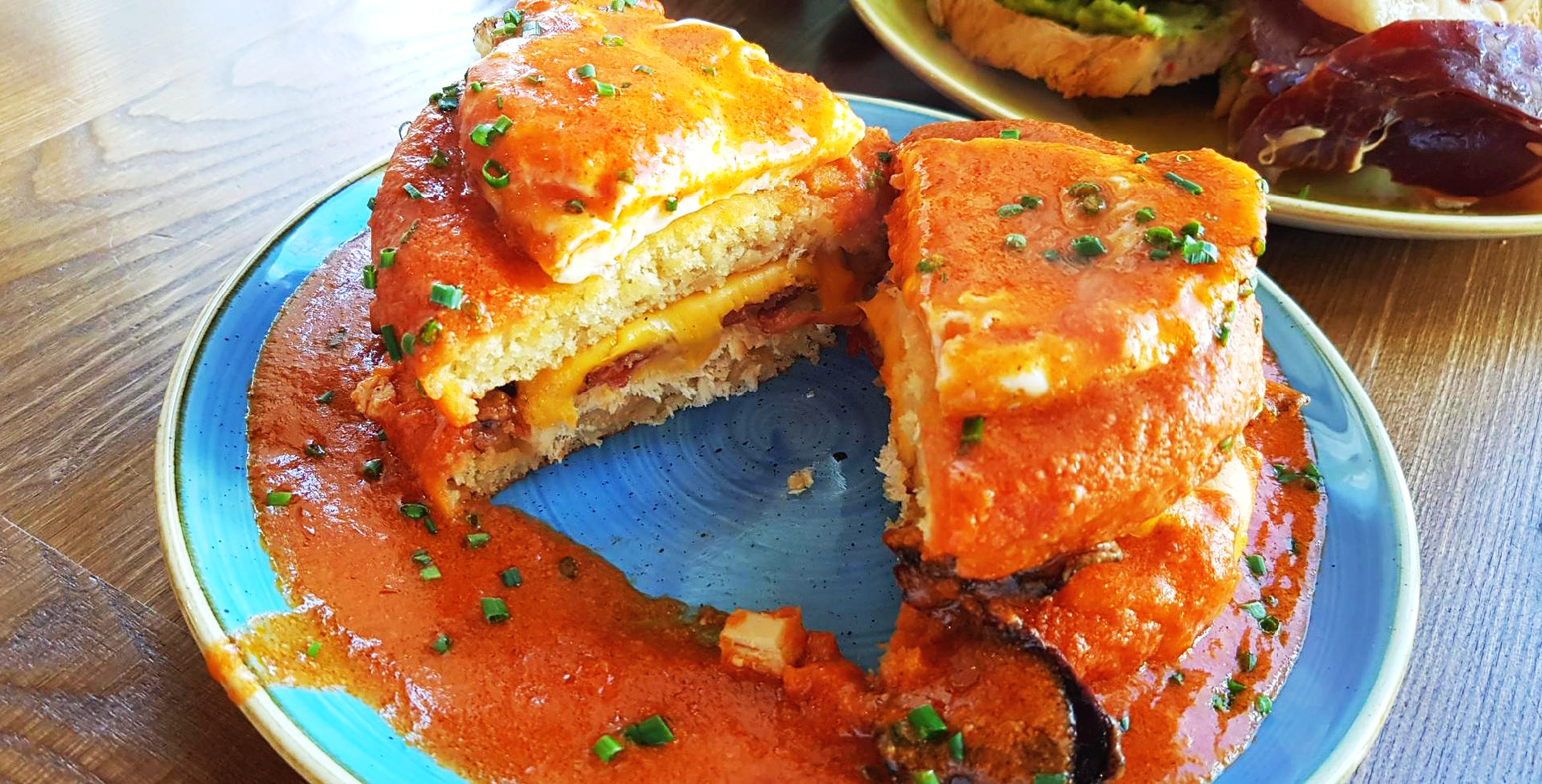 접시 - 팬케이크 - 햄 - 베이컨 - 치즈 - 팬케이크 - 계란 프라이 - 붉은 소스 - 파슬리!