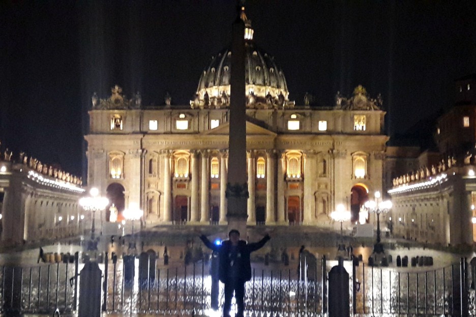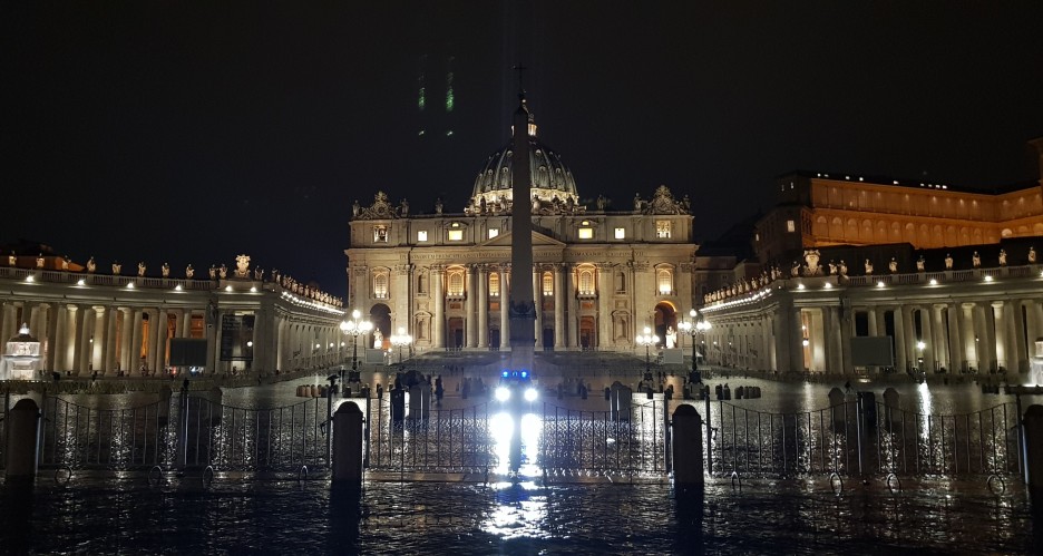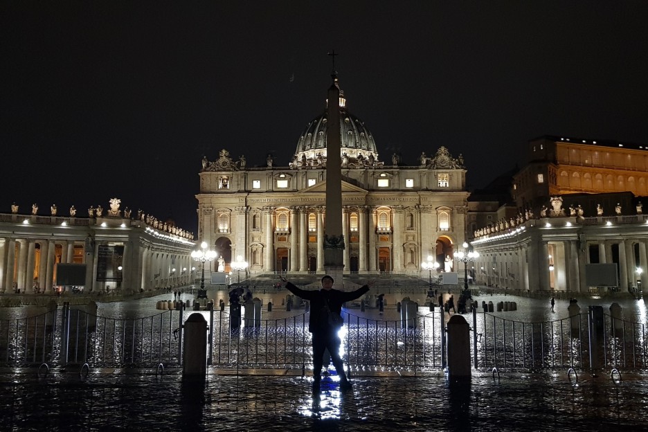얼마 지나지 않아 성 천사의 성과 성 천사의 다리가 나타났다. 15년도 유럽여행의 끝맺음이 바로 이곳이었다. 하필 바로 옆에 있던 이탈리안 커플들이 정말 강렬한 키스를 하고 있어서 더욱 강렬하게 기억이 남는 장소다. 예전에 함께 여행을 했던 동료들에게 그 장소의 사진을 보내고는 대망의 성 베드로 광장으로 향했다. 비가 내려서 그런가 광장에는 사람은 거의 없었다. 우리 같은 관광객이 사진만 찍고 가는 정도였다. 그런데 베드로 광장 정중앙에서 경찰차가 상향등을 켜고 떡 하니 서 있는 것이 아닌가. 예뻐야 할 광장과 성당 사진이 자동차 라이트에 모두 묻혀버렸다. 나의 거대한 몸으로 빛을 가려서 사진을 찍는 등 각고의 노력을 통해 사진을 얻어냈다.