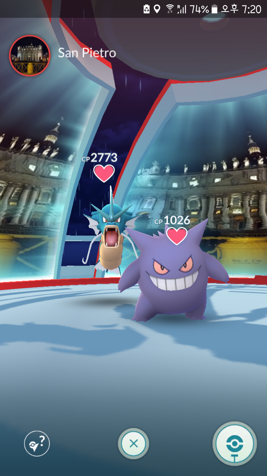 우리는 주변을 둘러보고, 근처 카페에서 간단한 식사를 하고 올드브릿지에서 맛있는 젤라또로 마무리할 예정이었다. 예정만. 근처에 5성 레이드 알이 여러 개 뜨기 시작했고, 이왕 온 김에 날씨 버프를 받은 가이오가를 잡기로 했다. 추운 날씨에 비까지 맞으니 손과 발이 점점 차가워지는 것을 느꼈으나 포기할 수는 없었다. 놀랍게도 근처에서 생성된 레이드는 전부 성공을 했다. 그래서 우리는 한껏 고무되어서 성 베드로 성당에서 레이드가 뜨면 그것을 잡고 AR 모드로 성 베드로 성당을 배경으로 사진을 찍으면 어떻겠냐는 이야기를 주고받고 있었다. 마침 놀랍게도 성당에서 생성되는 5성 알! 우리는 그때 그냥 밥이나 먹으러 갔어야 했다.